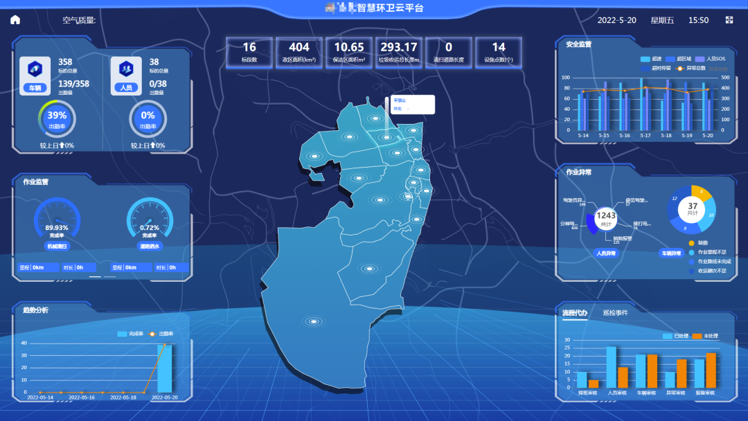 智慧环卫云平台是此次评选方案中的核心部分,由巅峰国际环境自主研发,汇集了全球智慧融合“大云物移智”技术,拥有超20项软件著作权,涵盖了“智慧环卫、智慧城管、智慧分类、智慧餐厨、智慧市政、智慧园林、智慧物业、智慧公厕”等八大软件产品和行业解决方案,能够实现对项目运营所涉及到的“人、车、物、事”构建“全时段、全方位、前后台无缝对接、精准高效” 的运维服务和远程监控管理模式,可以为环卫服务给予市场化、产业化、网联化、数字化运营给予技术方案和解决方案。当前,智云平台已服务全国环卫系统的380余个项目,为全国环卫产业科技变革、新业态打造不断注入新动能。